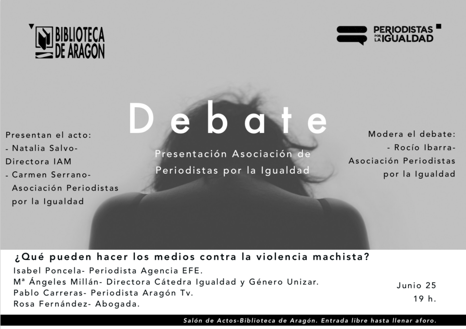 Con este tema de relevancia social, Periodistas por la Igualdad da el pistoletazo de salida en Aragón. Una Asociación de periodistas feministas (mujeres y hombres) que pretende acabar con la brecha de género en el ejercicio de su profesión. También dignificar el periodismo a través de buenas prácticas en la construcción de la imagen de la mujer ¿Cómo? Visibilizando el trabajo de las periodistas, reivindicando los mismos sueldos, denunciando casos de discriminación, acoso y cosificación de la mujer en los medios, generando debate sobre la ausencia de mujeres en puestos de decisión, creando grupos de trabajo para investigar en periodismo feminista…