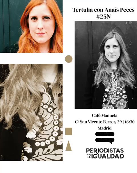 Este año celebramos el Día Internacional de la Eliminación de la Violencia contra la Mujer, el 25 de noviembre, con una tertulia pública con nuestra socia Ana Isabel Peces, recién premiada por el Ministerio de Igualdad por su activismo feminista desde el Periodismo. La tertulia es de entrada libre en el Café Manuela, en la calle San Vicente Ferrer 29, en Madrid, a las 16:00 horas del 25N. Directora de la serie documental ‘Rocío, contar la verdad para seguir viva‘, Anais Peces contará cómo hacer periodismo con perspectiva de género, contribuyendo a la eliminación de la violencia contra las mujeres.